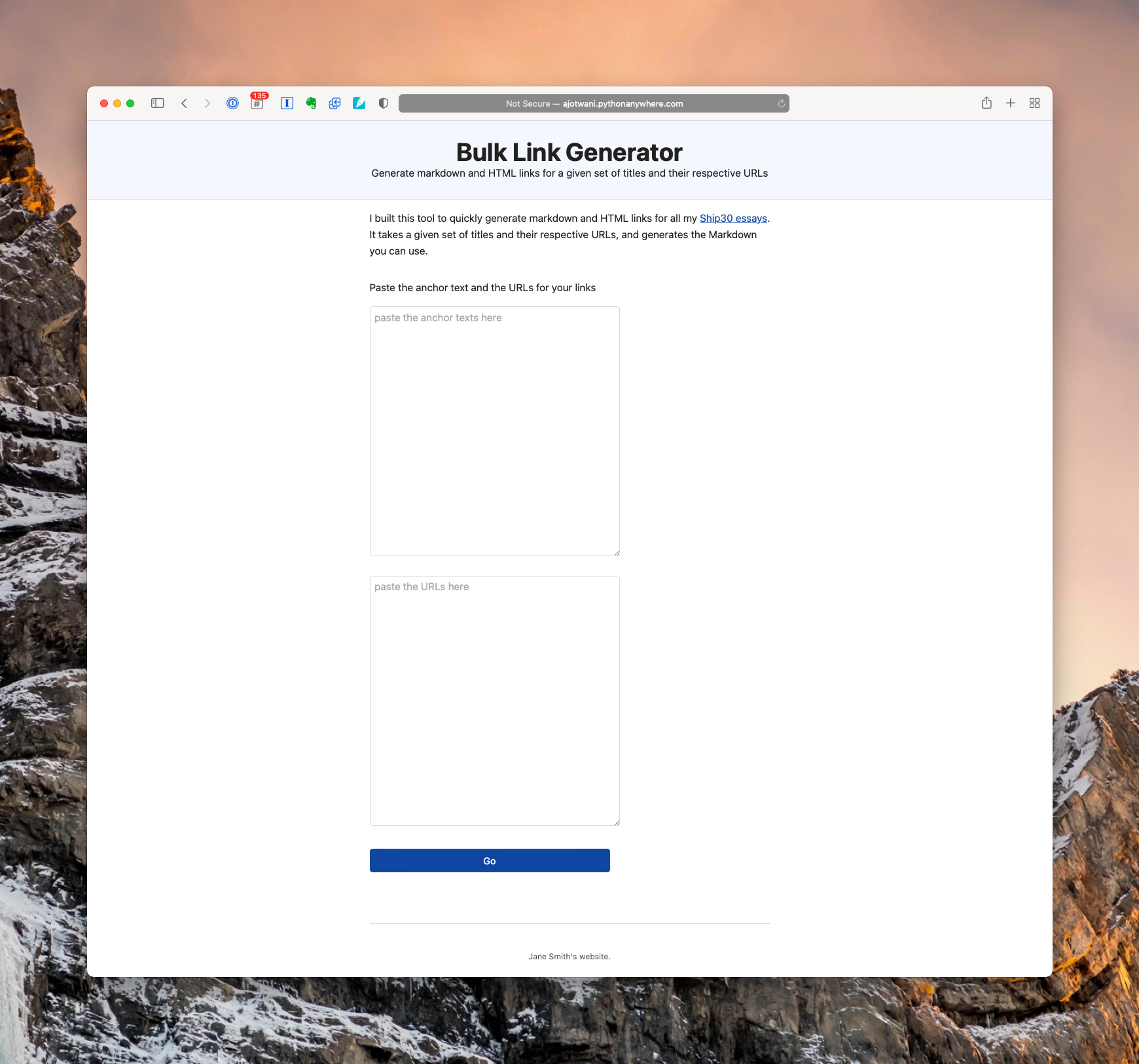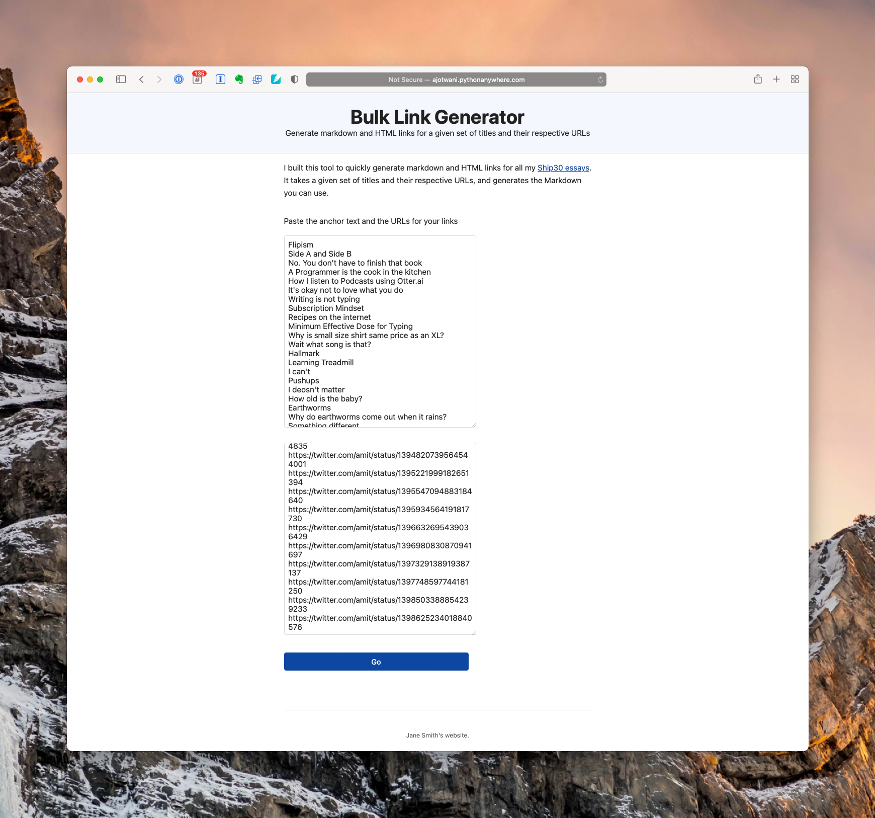 So, I did what any lazy human worth their salt would do. I built a quick little tool that accepts the "link text", and their respective "URLs", and turns them into Markdown, and HTML links.