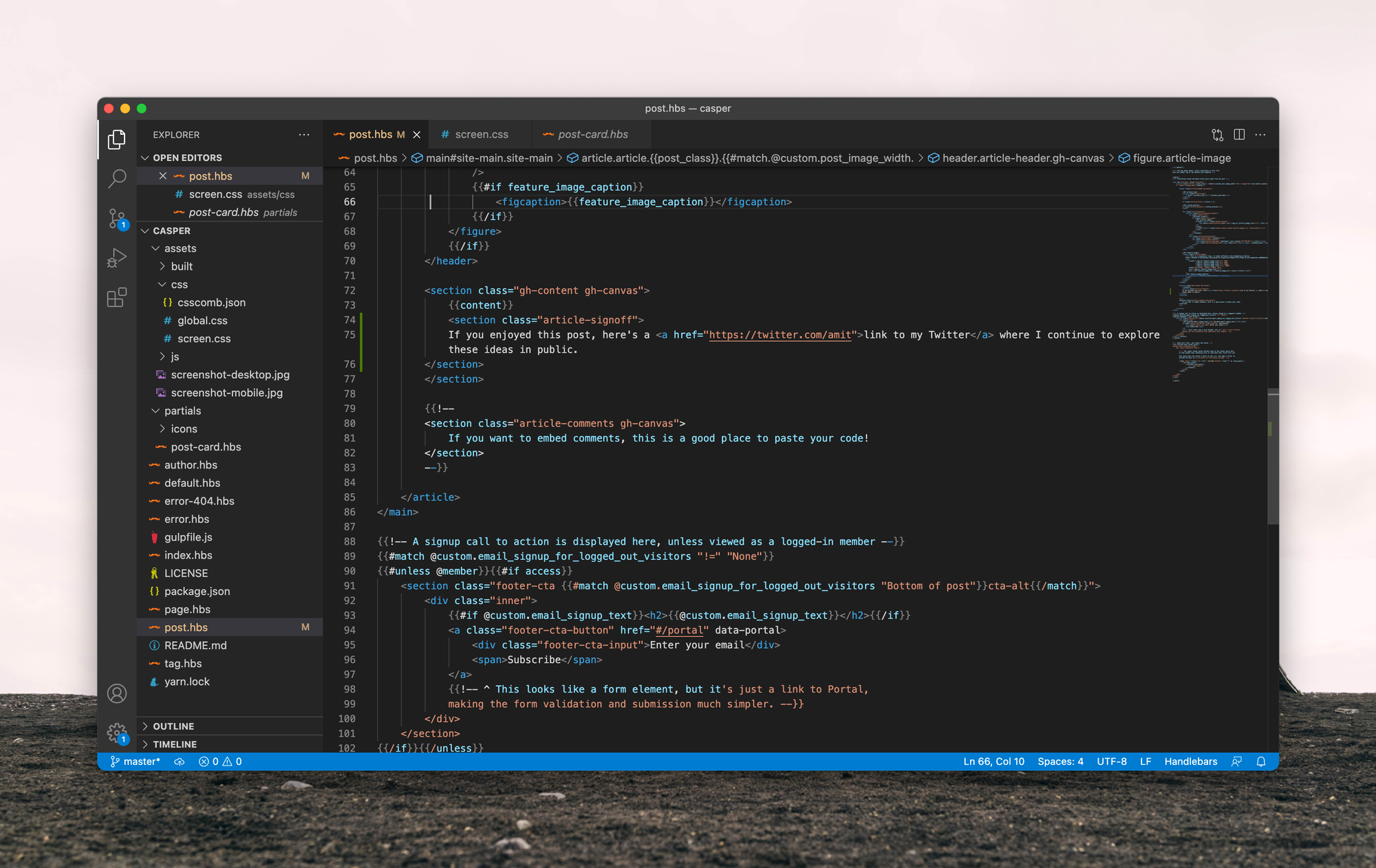 The easiest way to do this is to download the template from the site settings. Make the changes locally to the file "post.hbs", and then upload the template back up. Here's how to do this -
