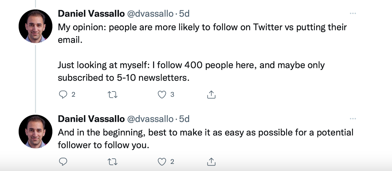 I recently saw a tweet that it's a good idea to have a CTA at the end of each article. In fact, Daniel Vassallo argued that the CTA should be pointing to Twitter instead of an email list.