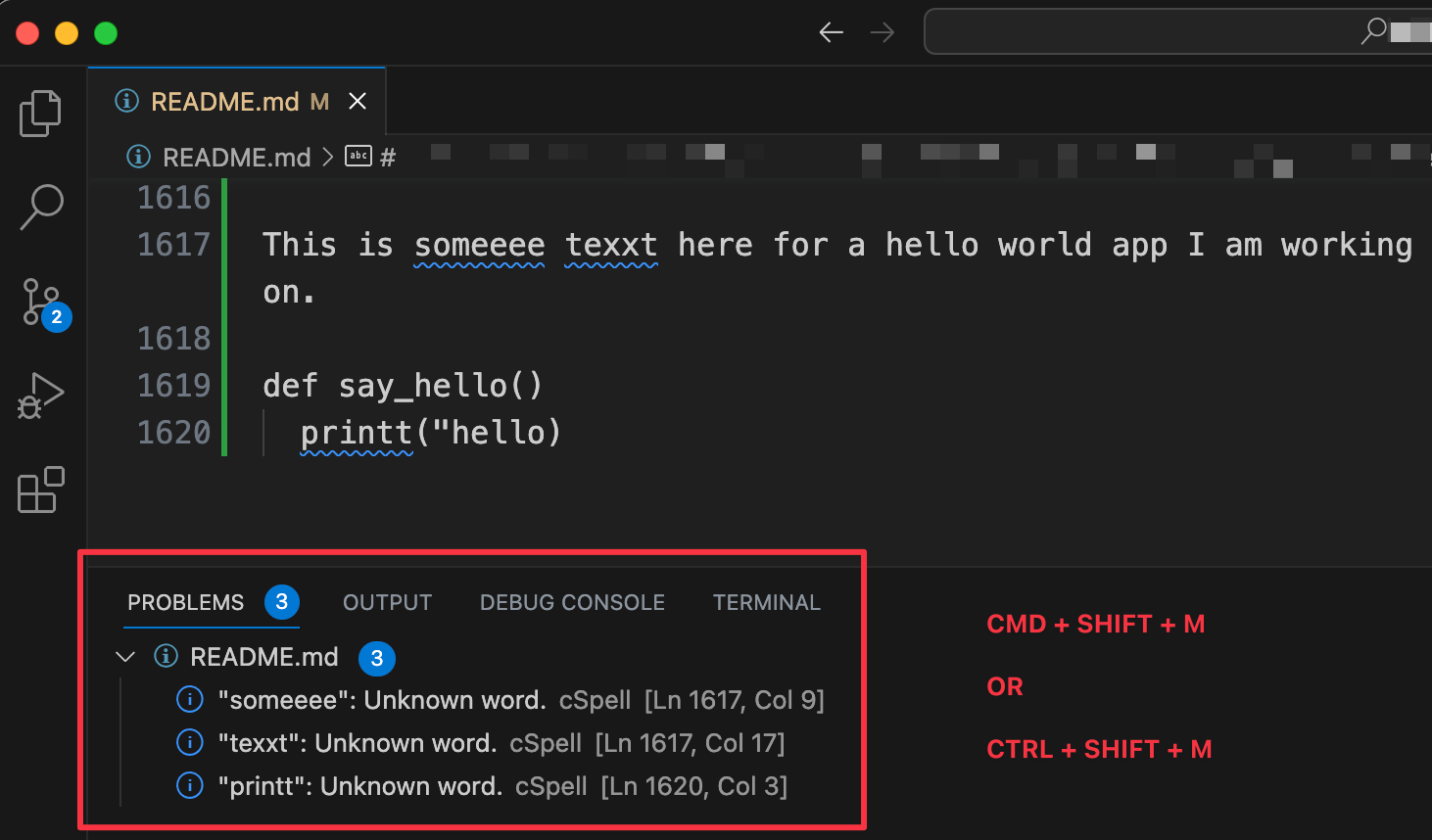 CMD + SHIFT + Mto see all spelling errors together in the 'Problems' pane. - Click on an error or highlight the word and press